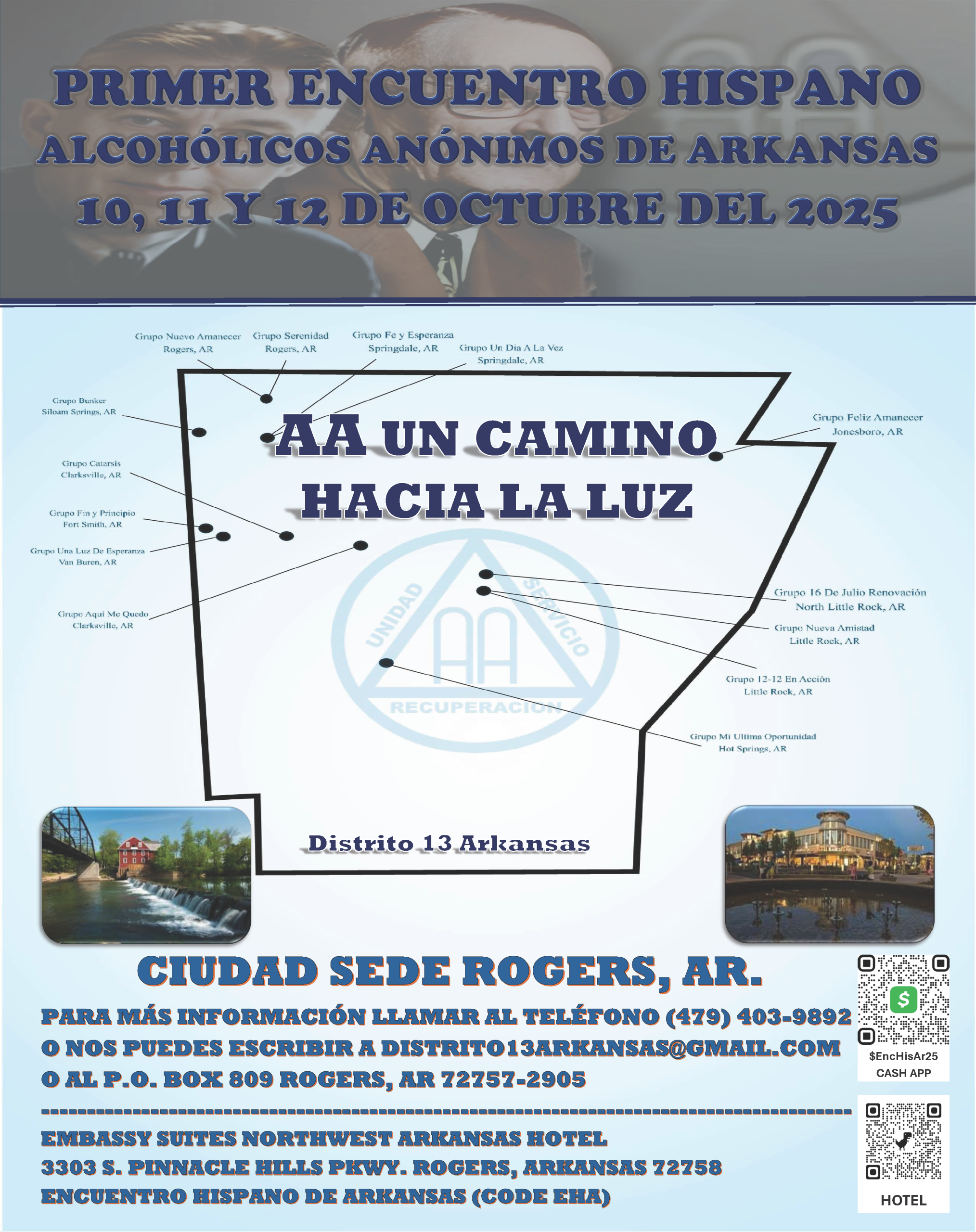 AA A Path to the Light First Hispanic AA Convention in Arkansas Alcoholics Anonymous Host City: Rogers, Arkansas For more information, call: (479) 403-9892 Email: distrito13arkansas@gmail.com Mailing Address: P.O. Box 809, Rogers, AR 72757-2905 Venue Embassy Suites Northwest Arkansas Hotel 3303 S. Pinnacle Hills Pkwy. Rogers, Arkansas 72758 Organized by District 13, Arkansas