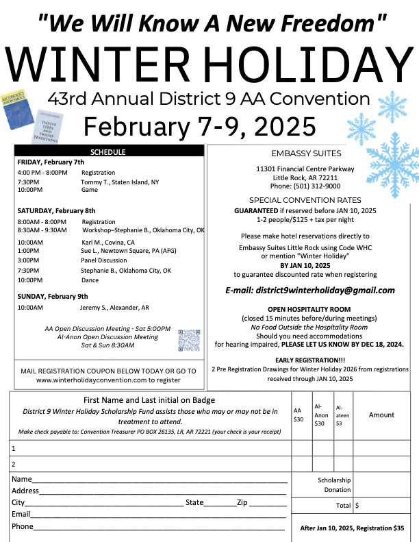 Summer Area Assembly is July 12th and 13th, 2025 This assembly will include the Delegate Report Back to the Area Zoom Meeting ID: 931 0896 7121 Passcode: Box459 Link to Area Assembly ZOOM Reserve your room at Holiday Inn Express & Suites-Russellville, 300 East Harrell Drive, Russellville Call the Hotel at (479) 219-5152 and mention
